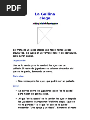 1 2 3 7 10juegotradicional from imgv2-2-f.scribdassets.com Objetivo el jugador que pare deberá descubrir a quién ha atrapado con la única ayuda del tacto. Un jugador hace de gallina ciega. Aquí encontrarás un tutorial para jugar a la gallinita ciega. Cómo jugamos la gallinita ciega es importante tener un grupo de niños para que sea aún más divertido jugar, se toma a uno de los participantes previa selección por sus compañeros, a este se le tapa los ojos y por medio de una canción comienza el juego, este debe atrapar a sus compañeros. Para jugar a la gallinita ciega se necesitan de 4 o más jugadores. Una aguja y un dedal… da tres vueltas y la encontrarás. Por lo demás, nada de raro tendría que el venidero 6 de diciembre se produjese un megaapagón a escala nacional y las gentes deban votar sin ver, amordazadas con sus tapabocas y jugando a la gallinita ciega. La gallinita ciega resumen de la actividad: